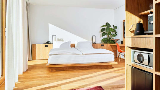 The hotel has 33 design rooms and suites, ranging between 17 and 42 square meters. The rooms feature bespoke custom beds and bathrooms of Lasa marble with the oak wood